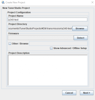 Enter name for your project and click the Other / Browse checkbox. You should select TCU definition file (one with .ini extension) – extract it from firmware archive. Click Next and configure the connection type with the TCU: